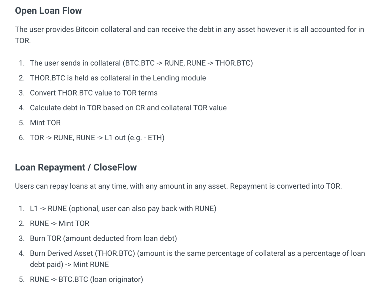 • mechanics how lending works (your collateral assets are basically swapped for RUNE and then for derived assets, e.g. thor.btc, which is held as collateral)