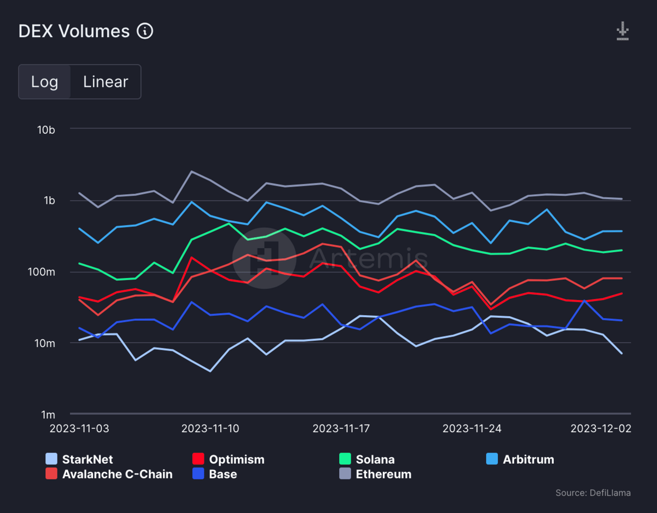 Solana is currently the chain with the most active addresses and txs. Since October, it’s also ramping up the DEX volume.